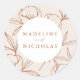 Élégants autocollants de mariage fleuris avec vos noms en cannelle avec un arrière - plan de ligne florale contre un arrière - plan crème moucheté. Des autocollants de mariage personnalisés parfaits pour les scellés d'enveloppe et pour sceller les sacs de faveur de mariage. Conçu pour coordonner avec notre collection de mariages floraux botaniques modernes.