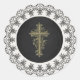 C'est une belle image traditionnelle religieuse catholique d'un crucifix en or sur un arrière - plan noir avec une bordure décorative.