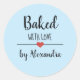 Autocollant moderne "cuit avec amour" avec une police noire sur un arrière - plan bleu clair agrémenté d'un coeur rouge mignon. Customiser du texte.