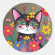 Sticker Rond Cute Folk Art Chat noir et fleurs
