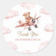 Cet autocollant de baby shower mignon comporte un ours en peluche fille volant un avion parmi des nuages moelleux avec le texte "Merci" et personnalisé avec votre texte personnalisé.