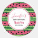 Anniversaire / Événement merci autocollants avec un motif de pastèque mignon. Croûte verte en couches de rayures avec une couche de rayures roses avec des graines noires à l'intérieur. Amusement et design estival.