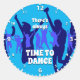 Sticker rond TIME TO DANSE élégant et coloré, montrant des graphiques de silhouettes dansantes. Les couleurs sont bleu foncé, bleu cyan, mauve et blanc. Lit le texte IL EST TOUJOURS LE TEMPS DE DANSER dans la typographie blanche. Le texte est PERSONNALISABLE, vous pouvez donc le remplacer par du texte ou un nom de longueur similaire. Disponible en d'autres couleurs.
