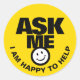 Sticker Rond Demande-moi Je suis heureux d'aider jaune noir