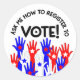 Votre vote est votre voix, alors comment l'amplifiez-vous ? Aidez les autres à s'inscrire pour voter ! Rejoindre nos voix ensemble, c'est comment le changement se produit vraiment. Cette conception a des mains rouges, blanches et bleues avec des étoiles et dit, "Demandez-moi comment m'inscrire pour voter !" Faites savoir à d’autres que vous êtes une ressource qui peut les aider à se connecter à leur propre voix et à avoir leur mot à dire dans l’avenir de notre pays. Chaque vote compte !