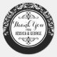 Élégant merci sticker personnalisable modèle. Dentelle florale blanche avec arrière - plan noir et cercle blanc avec bordure noire, pour texte personnalisable pour votre nom. Ameublement floral noir. Si vous avez besoin d'aide pour customiser un de mes designs, contactez le concepteur ArtOnWear. Mise en forme de texte gratuite avec aide en direct disponible sur demande.