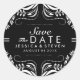 Elégante dentelle florale blanche tourbillonne sur l'arrière - plan noir personnalisé que vous pouvez changer. Personnalisable enregistrer la date, enregistrer la date, mariage autocollant modèle. Si vous avez besoin d'aide pour customiser un de mes designs, contactez le concepteur ArtOnWear. Mise en forme de texte gratuite avec aide en direct disponible sur demande.