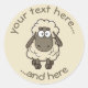 Caricature de mouton beige. Deux champs de texte sur cercle.