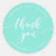 autocollant Merci avec les mots "merci" dans un script de relaxation cursive en blanc contre un arrière - plan de menthe pastel. Personnalisez-le en remplaçant le texte de l'espace réservé. Pour plus d'options comme changer la police et sa taille/couleur, développer la courbe /contrat ou l'espacement entre les lettres cliquez sur le bouton "Personnaliser". *Veuillez noter que le filigrane Zazzle qui apparaît dans l'aperçu du zoom n'apparaîtra PAS sur le produit imprimé final. © Bois de rose et agrumes