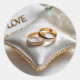 Deux anneaux mariages sur un amour coussin blanc écrit sur des autocollants d'or
