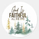 L'autocollant chrétien représente une aquarelle naturelle simple avec une forêt de pins verts et d'or. Il présente une citation inspirante encourageante, "Dieu est fidèle tout le temps."_