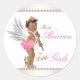 Dieu merci pour les petites filles autocollants de baby shower avec adorable princesse d'ange ethnique afro-américaine portant un joli pantalon rose, un chapelet de perles, des chaussures à talons hauts et une jolie couronne d'or sur un arrière - plan de perle rose et or. Vous pouvez ajouter le texte de votre choix à personnaliser et modifier la couleur de l'arrière - plan. Il s'agit d'un design imprimé sans perles réelles, or, etc.
