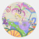 Femme blonde dans un cadre coloré Steampunk. Elle est assise dans une cabine de bain/teacup. Elle porte un casquette rose avec des plumes rose et verte. Le chariot ou la tasse est bleu, vert, violet avec un peu de jaune. Son parasol est bleu, jaune, rose, violet et jaune. Il y a un dragon violet aux ailes colorées, et un oiseau tropical multicolore. Les roues sont jaune-orange avec rayons rouges et jantes vertes.