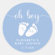 Bons stickers bleu pastel pour votre bébé garçon douches faveurs et la correspondance avec "oh garçon" dans un script blanc élégant avec des swashes et une aquarelle blanche de pieds bébé. Sous vous pouvez facilement personnaliser avec votre nom et votre date de douche.