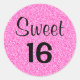 Étiquette ronde 16 sucrée avec parties scintillant rose vif et brillant noir.