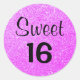 Étiquette 16 rond douce avec éclat de parties scintillant violet glam et écriture noire audacieuse.