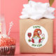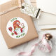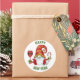 Sur cet autocollant est un joli elfe de gnome habillé d'un chapeau de Père Noël motif de rennes rouge et or. Il tient un verre de vin du Père Noël d'une main, et un sucre de canne rayé rouge et blanc de l'autre. Le texte vert en haut et en bas dit "HEUREUX NOUVEL AN".