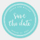 Autocollant élégant et rond "Save the Date" sur le thème nautique avec une bordure à rayures blanches et le texte "save the date" dans un script pinceau tendance sur fond turquoise. Utilisez-le pour sceller vos enveloppes. Découvrez d'autres articles de mariage ici https://www.zazzle.com/rosewoodandcitrus/gifts?cg=196540141241316965&rf=238364477188679314