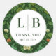 This elegant wedding sticker features a circular design with a lush, botanical theme. The vibrant green background is adorned with stylized flowers in shades of cream and orange, creating a timeless and sophisticated look. At the center, bold serif typography spells out "THANK YOU," conveying gratitude in a classic style. Perfect for adding a personal touch to wedding favors or gifts, this sticker captures the celebratory mood of your special day.