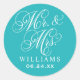 Mariage préférence autocollant caractéristiques "Mr. & Mrs" dans une police de script de calligraphie blanche avec un design monogramme personnalisé qui peut être personnalisé avec le nom marié de la mariée et le nom du marié et la date du mariage. Couleur arrière - plan turquoise / bleu turquoise peut être customisée.