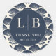 This elegant wedding sticker features a circular design with a navy blue background and white shell motifs, creating a harmonious and nautical-inspired look. The centerpiece includes prominent initials "L" and "B," accompanied by the phrase "THANK YOU" in classic serif typography, conveying gratitude and formality. The vintage style is enhanced by symmetrical arrangements and clean lines, making it perfect for expressing appreciation at your special event. Ideal for adding a personalized touch to favors or gifts, this sticker combines sophistication with a beachy charm.