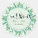 Élégant Sticker Feuille Vert Mariage Merci Classic Rond. Le design a un arrière - plan feuille vert avec LOVE & THANKS écrit dans une jolie police et de l'espace pour ajouter les noms du couple et la date du mariage. Ce mignon autocollant peut être facilement customisé en changeant les noms et la date. Pour toute personnalisation supplémentaire, n'hésitez pas à me contacter à l'adresse mypaperlove2021@gmail.com