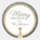Simple, élégant, minimaliste, parties scintillant argent personnalisé Joyeux autocollant Noël, avec pin de feuille d'or et script de calligraphie moderne.