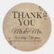 Ces élégants stickers de faveur de mariage ou étiquettes disposent d'un style rustique, faux parchemin papier arrière - plan design qui ressemble à un parchemin de style antique. Le texte et les images sur l'autocollant sont imprimés dans une belle couleur chocolat. Le texte peut être personnalisé avec vos propres noms et informations de mariage. L'expression "Merci" est imprimée dans une grande police sophistiquée, suivie des titres "M." et "Mme" et du nom du nouveau couple dans une police élégante. La date du mariage est imprimée en bas. Deux décorations de style floral sont présentées en haut à droite et en bas à gauche.