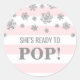 Baby shower Elle est prête à POP préférez les autocollants de marque dans des rayures rose pâle et blanche motif avec des flocons d'argent, parfait pour un baby shower d'hiver ou de Noël.
