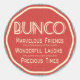 Style vintage design graphique Bunco sticker Caractéristiques un arrière - plan rayé élégant avec un emblème de bannière. Texte : Bunco, merveilleux amis, merveilleux rires et temps précieux. Attachez les autocollants Bunco aux cadeaux, enveloppes d'invitations ou sceau de serviette.