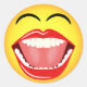 Face - SYFE100 © Sunny Mars Designs. Ces autocollants ronds cool, humoristiques, amusants et de nouveauté présentent une illustration amusante d'un émoticône au visage jaune riant avec une grande bouche ouverte, des dents nacrées blanches, une langue et des yeux fermés. Concept pour l'humour.