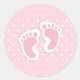Stickers avec une adorable image d'empreintes de filles roses avec un contour blanc épais. Pois blancs sur un arrière - plan rose derrière l'illustration.
