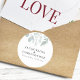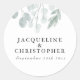 Le design de l'autocollant rond faire-part de mariage comprend un bouquet de verdure d'eucalyptus aquarelle et un élégant ensemble sophistiqué de polices. Voir le lien de collection sur cette page pour voir tous les éléments correspondants dans cette belle conception.