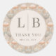 This elegant wedding sticker design features a sophisticated floral pattern in soft pastel hues of peach, pink, and beige. The central circular motif showcases refined typography against a delicate background, creating an air of timeless romance and gratitude. Perfect for expressing thanks to guests on your special day, the harmonious color palette and intricate detailing evoke a warm, inviting mood. These stickers are ideal for adding a personalized touch to envelopes or favors, enhancing the overall charm of your wedding stationery with their classic and graceful aesthetic.