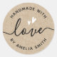 Des autocollants ronds aux coeurs blancs, le texte "fait main avec amour" et votre nom personnalisé sur une image imprimée papier Kraft look arrière - plan. Le mot "amour" est écrit dans une police élégante de script de calligraphie. Utiliser comme scellés d'enveloppe, autocollants pour les cadeaux et les faveurs, emballage de produits, etc. Suivez-nous sur Facebook : @businessstationery pour plus de produits, nouvelles, ventes et plus encore.