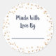 sticker "Fabriqué avec amour par" avec des étoiles d'or et un script bleu de minuit.