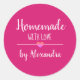 Autocollant moderne "fait maison avec amour" avec une police blanche sur un arrière - plan rose agrémenté d'un coeur mignon. Customiser du texte.