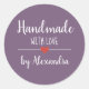 Autocollant moderne "fait main avec amour" avec une police blanche sur un arrière - plan violet agrémenté d'un coeur rouge mignon. Customiser du texte.