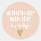 Un autocollant personnalisé "fait maison avec amour" avec un coeur doré sur un arrière - plan rose. Faites-le le vôtre en ajoutant votre propre nom. Une touche de finition pour tous vos cadeaux de la Saint-Valentin faits maison et d'autres occasions de cadeaux. Conçu pour vous par Blackberry Boulevard.