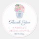 Autocollants de remerciement pour tout événement (illustrés ici pour une douche de mariage mais tous les champs de texte sont personnalisables). Le design présente des roses de jardin roses et du feuillage dans un vase de style pot à gingembre bleu et blanc.