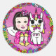 Fée blanche ou asiatique avec peau claire et cheveux noirs avec une licorne arc-en-ciel avec un papillon sur son nez. Arrière - plan magenta. Il est mignon de sceller les invitations d'anniversaire ou les sacs de faveur.