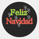 Le texte rouge et vert avec des flocons de neige blancs dit "Feliz Navidad" sur les cartes de voeux, les tasses, les sacs fourre-tout, les boutons, les T-shirts, et bien plus encore.