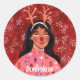 Portrait moderne et attrayant d'une femme habillée comme Rudolf le renne. Un joyeux arrière - plan rouge aux sprigs de baies. La femme porte un pull de Noël rose avec des arbres de Noël et des rennes. Ses cheveux noirs se distinguent agréablement par rapport à l'arrière - plan rouge. Peinture acrylique originale avec crayon sur papier. OEuvre originale de Caroline Bonne Müller