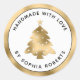 Bordure d'or et Arbre de Noël fait main avec amour Cadeau de Noël personnalisé Sticker rond classique... Fabriquez-vous des vêtements, des ornements ou des accessoires faits à la main pour des cadeaux de vacances cette année? Notre autocollant cadeau de vacances/étiquette affiche une élégante bordure en feuille d'or autour du texte : "Fabriqué à la main avec amour" et "par votre nom." Au centre se trouve un arbre de Noël en feuille d'or qui se coordonne avec la bordure en feuille. Vous pouvez facilement changer votre nom et le nom du produit sur le modèle de personnalisation.