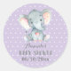 Autocollant rond classique Fête de bébé éléphant fille Violet et Gris