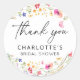 Exprimez votre gratitude avec style grâce à cet autocollant rond classique de remerciement de baby shower élégant et floral rose, orné d'une délicate aquarelle de fleurs sauvages colorées, mettant en valeur les floraux roses poudrés, entrelacés de verdure luxuriante et de papillons gracieux. Conçu avec une calligraphie sophistiquée, cet autocollant ajoute une touche raffinée et romantique, parfait pour sceller les sacs de faveurs, les enveloppes ou les cadeaux. Un détail charmant pour compléter une garden-party ou un baby shower "l'amour est dans les fleurs", laissant aux invités une impression sincère et élégante.