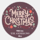 Célébrez les vacances en style avec cet autocollant rond moderne avec un arrière - plan bordeaux et une typographie joyeuse blanche et rouge. Le message "Joyeux Noël" est orné de saints, de flocons de neige et de billes, créant un design ludique mais élégant. Personnalisable avec votre nom de famille et votre année, cet autocollant est parfait pour ajouter une touche personnelle à vos cartes de fin de année, cadeaux et faveurs de fête. Le mélange d'éléments festifs et de teinte turquoise foncée et tendance apporte une touche contemporaine à vos salutations saisonnières. Merci de visite.