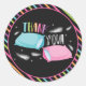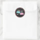 Autocollant Rond Classique Fête Pyjama Néon Arc-en-Ciel Merci . Ce design présente un oreiller rose et bleu avec des plumes et des étoiles. Les couleurs néon arc-en-ciel vives ressortent vraiment sur le fond à rayures noires arc-en-ciel.