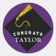 Des autocollants-cadeaux violets pour graduation et la fête favorisent le design étiquette avec capuchon de graduation noir avec goût or. Modifier le texte pour ajouter le nom du diplômé.