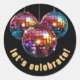 Fêtons ! autocollant avec trois boules de disco colorées sur un arrière - plan noir. Le texte est dans une police dorée. Si vous voulez un autre texte, il est personnalisable et facile à modifier. Cet autocollant convient à la plupart des événements, fêtes et célébrations. Ajoutez à votre courrier, sacs cadeaux, objets de fête d'anniversaire ou autre. Disponibles dans plusieurs tailles. Feuilles d'autocollants de 6 ou 20.